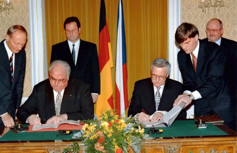 Auf der Aufnahme ist die feierliche Unterzeichnung der Deutsch-Tschechischen Erklärung zu sehen: Am Tisch sitzen die beiden wichtigsten Vertreter der beiden Regierungen (der tschechische Ministerpräsident Václav Klaus rechts und der deutsche Bundeskanzler Helmut Kohl links).