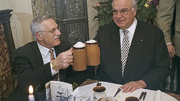 Václav Klaus (vlevo) a Helmut Kohl (vpravo) si připíjejí pivem jako symbolické "zapití" dohody.